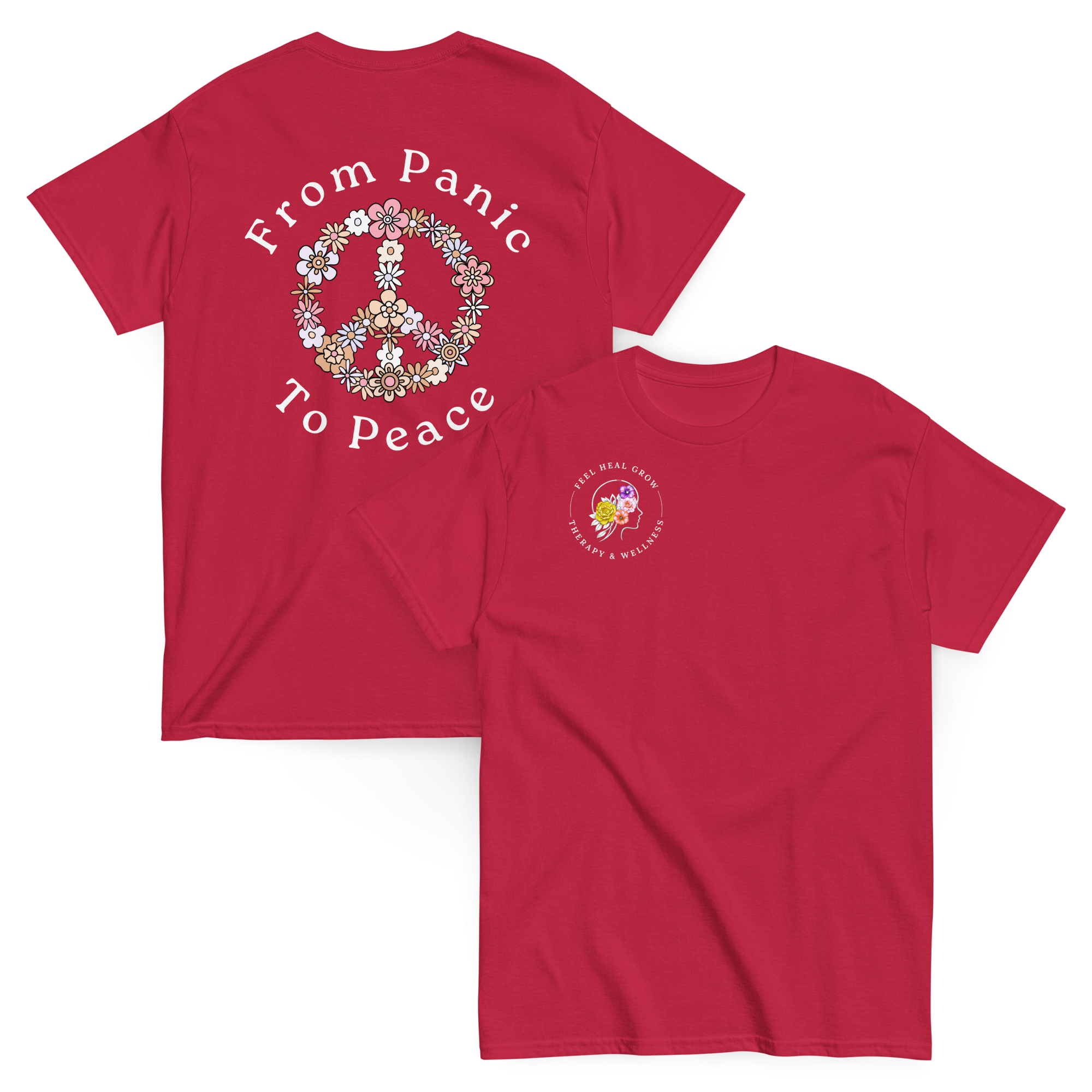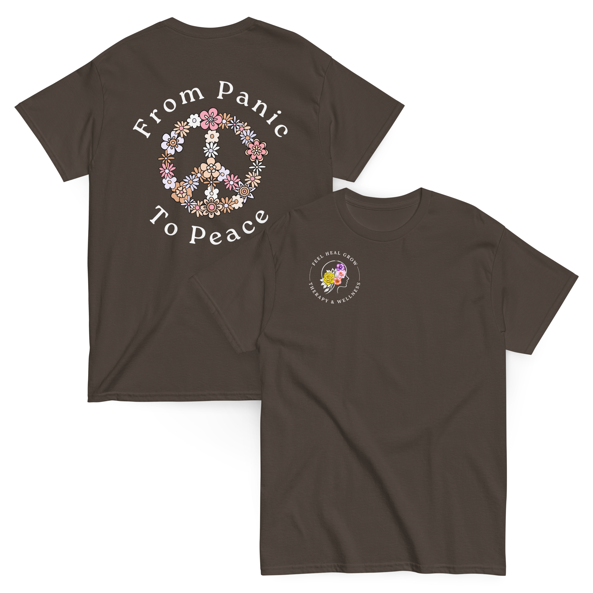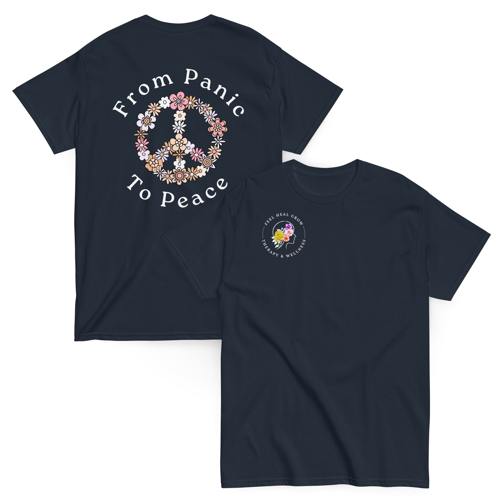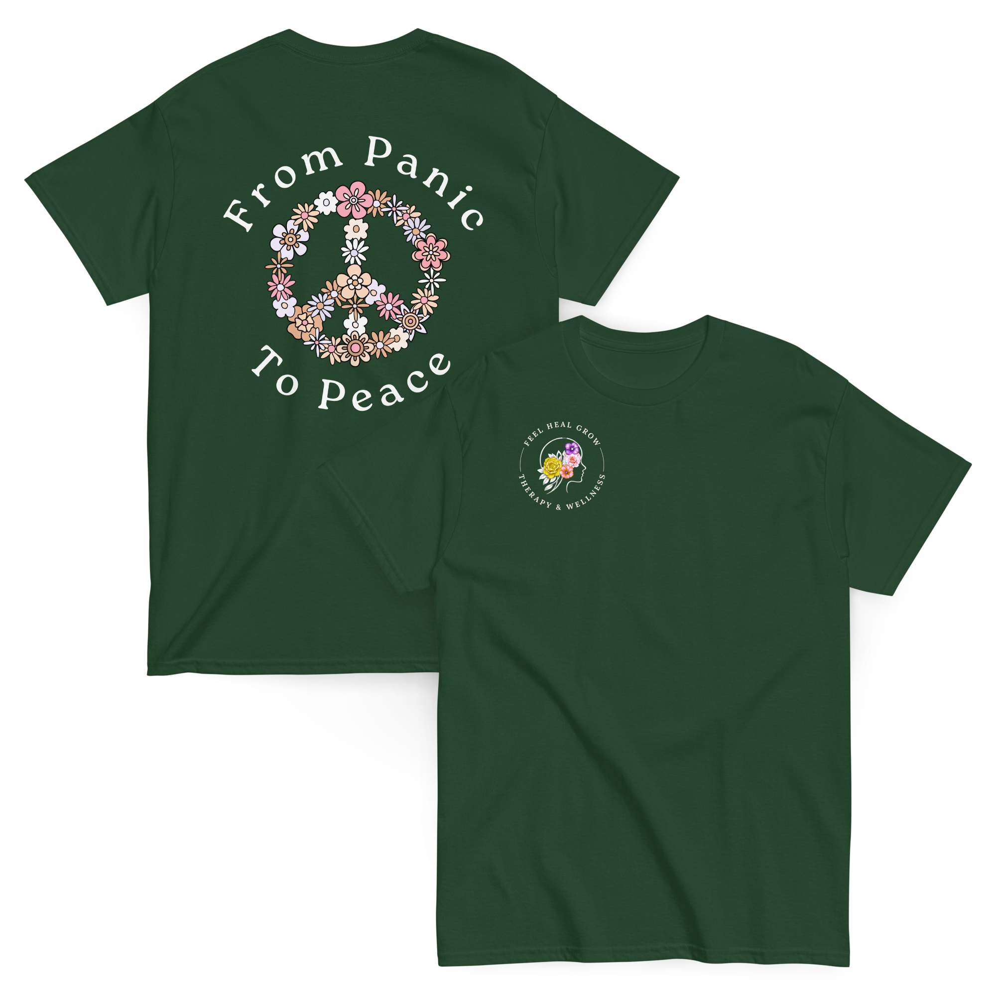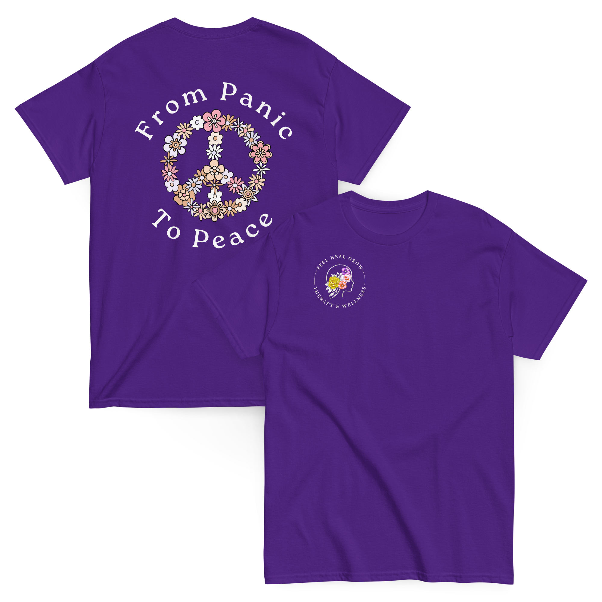 A soft, everyday reminder that healing is possible. This women’s tee features the Feel Heal Grow Therapy & Wellness logo on the front, with a floral peace sign and the words “From Panic to Peace” on the back—symbolizing the journey from overwhelm to grounded calm. Designed for comfort and intention, it’s perfect for wherever you are in your healing process.