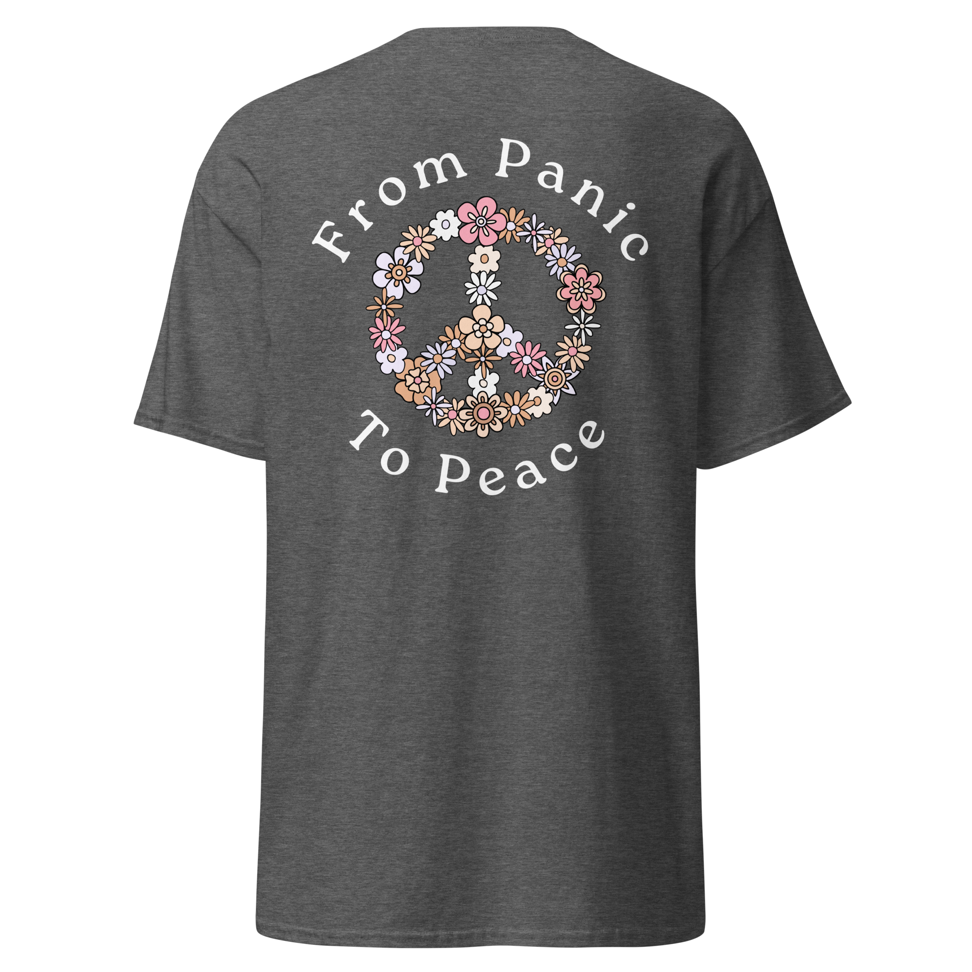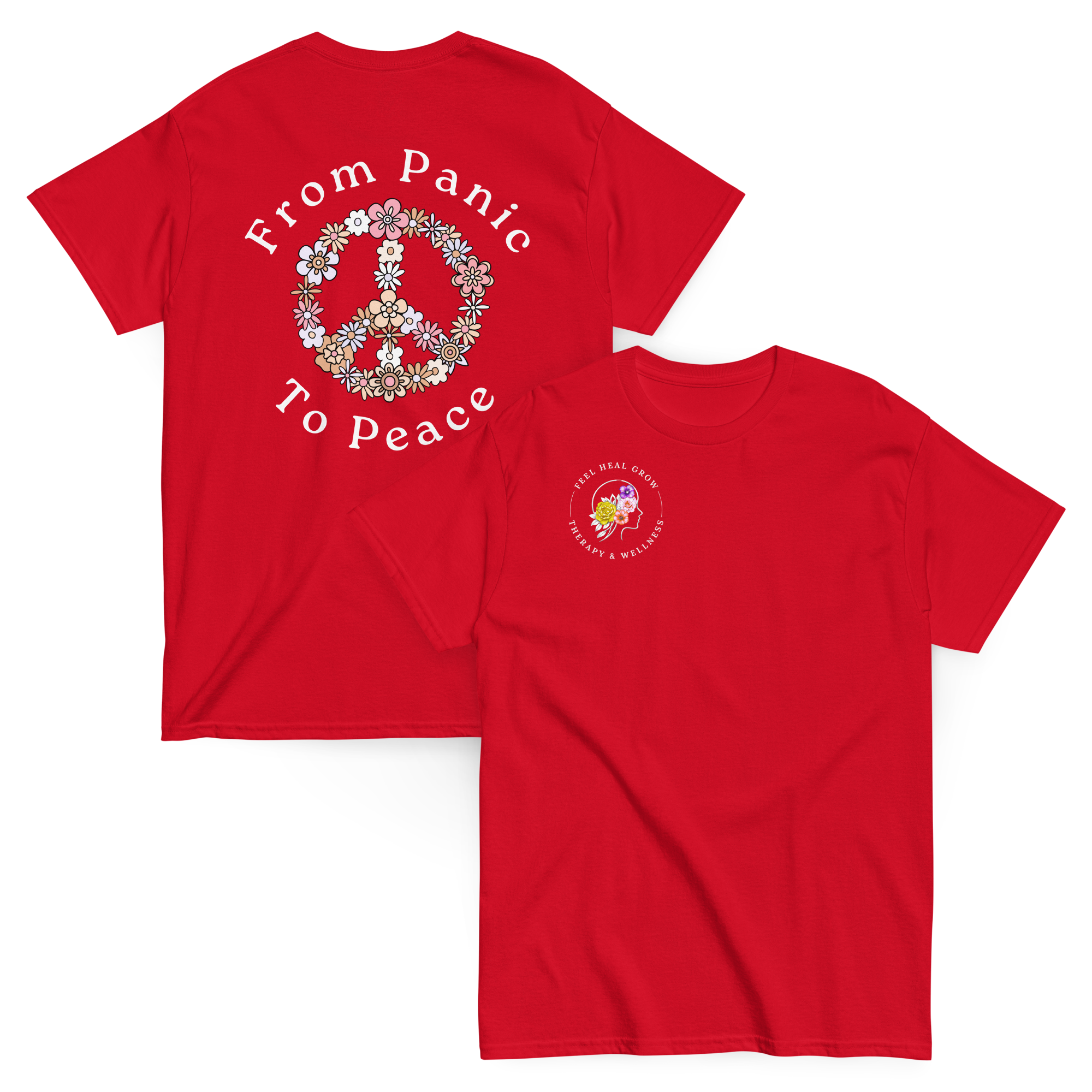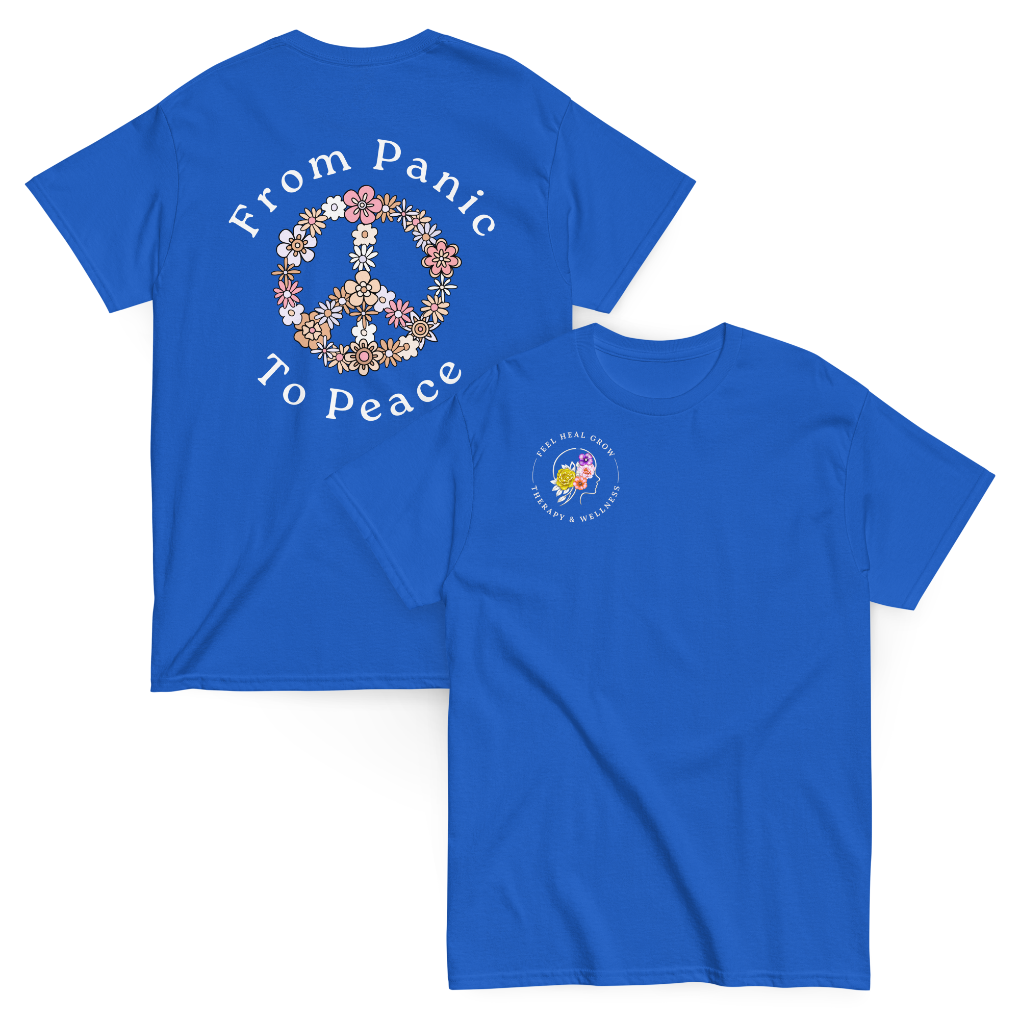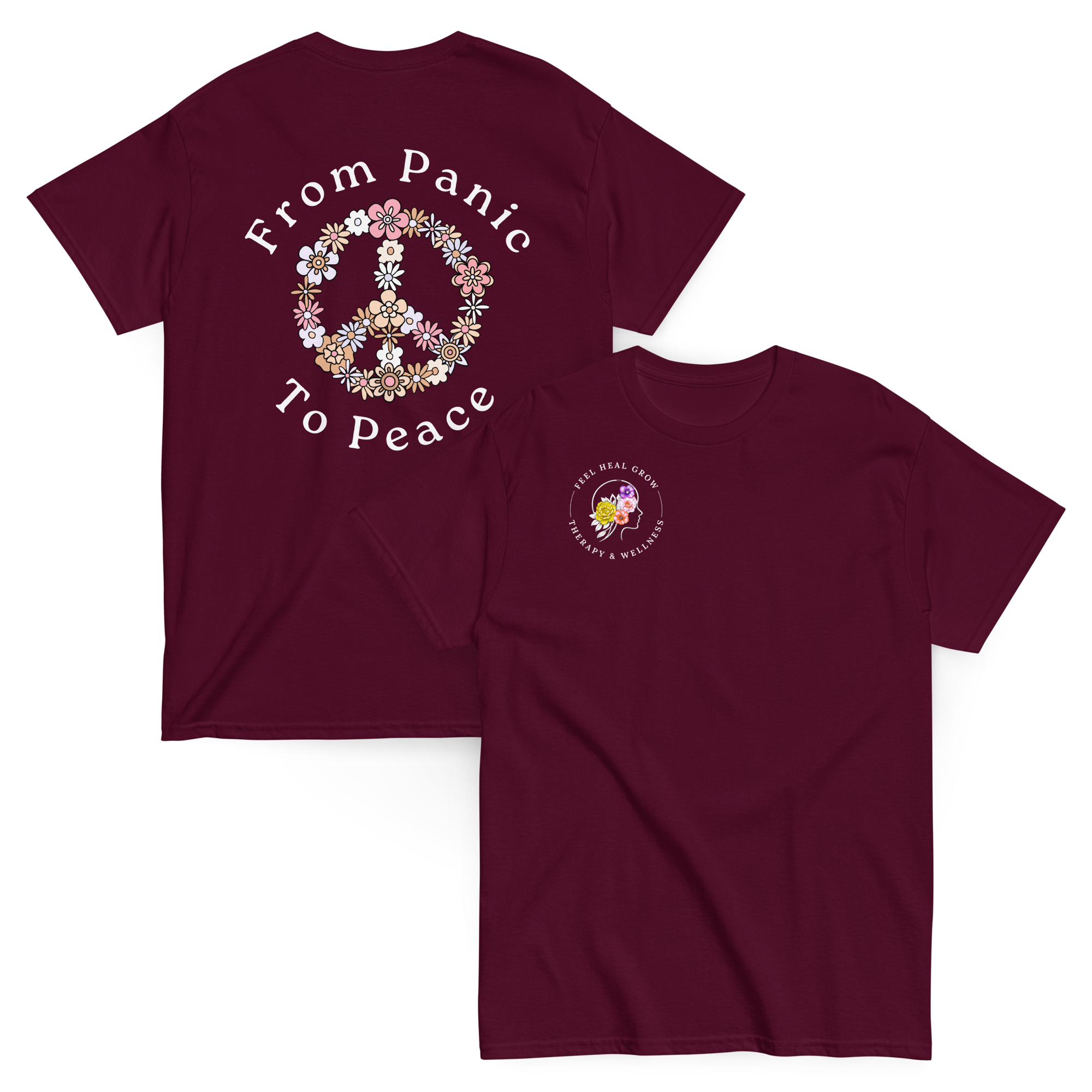 A soft, everyday reminder that healing is possible. This women’s tee features the Feel Heal Grow Therapy & Wellness logo on the front, with a floral peace sign and the words “From Panic to Peace” on the back—symbolizing the journey from overwhelm to grounded calm. Designed for comfort and intention, it’s perfect for wherever you are in your healing process.