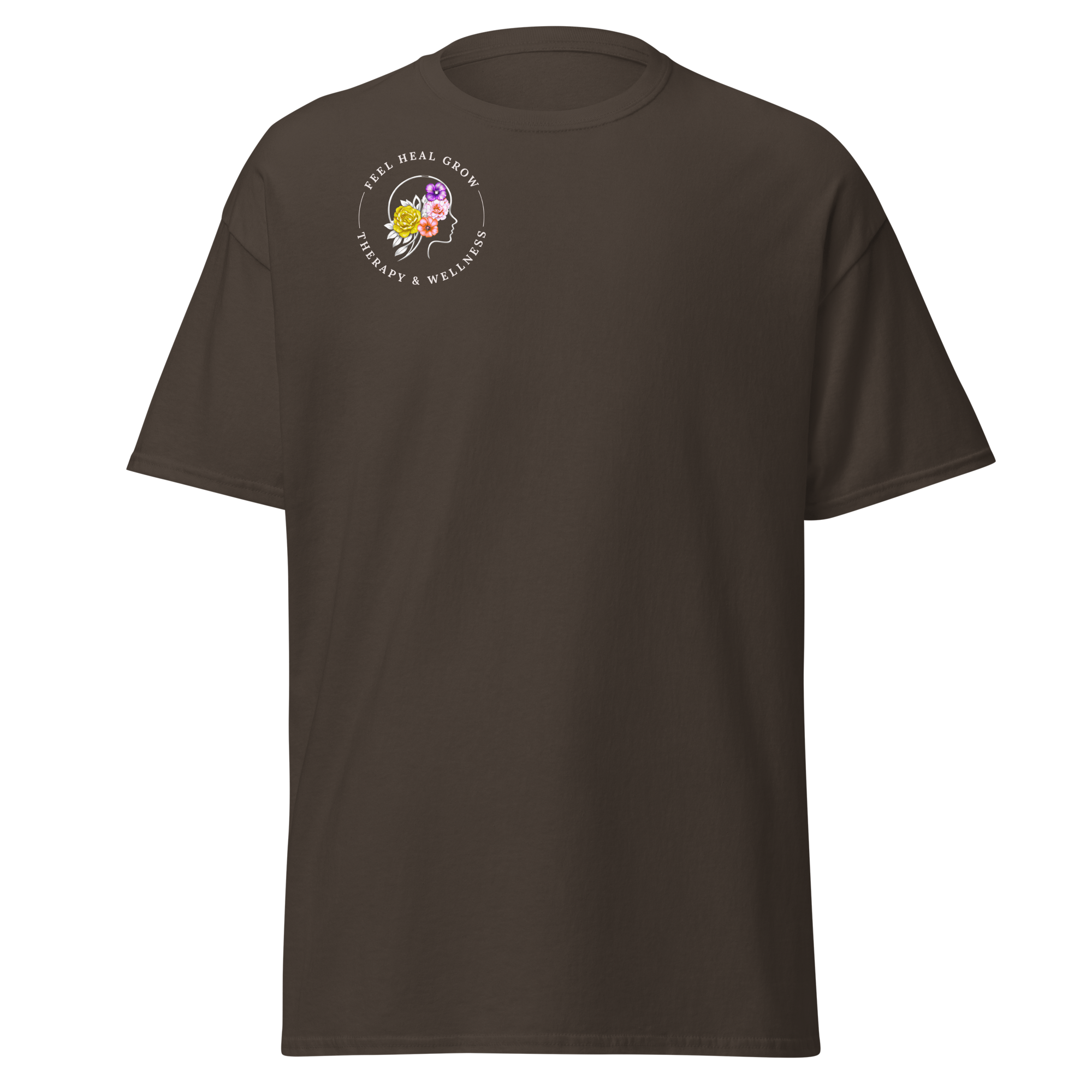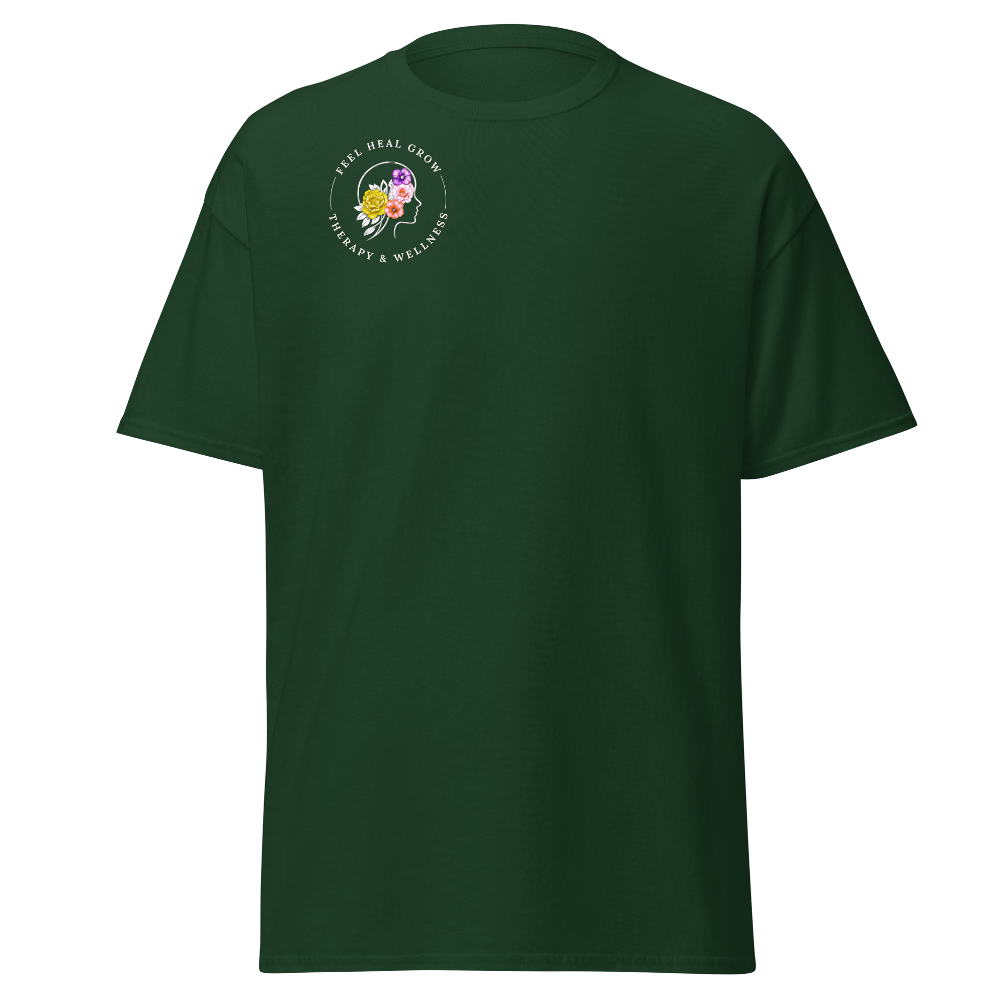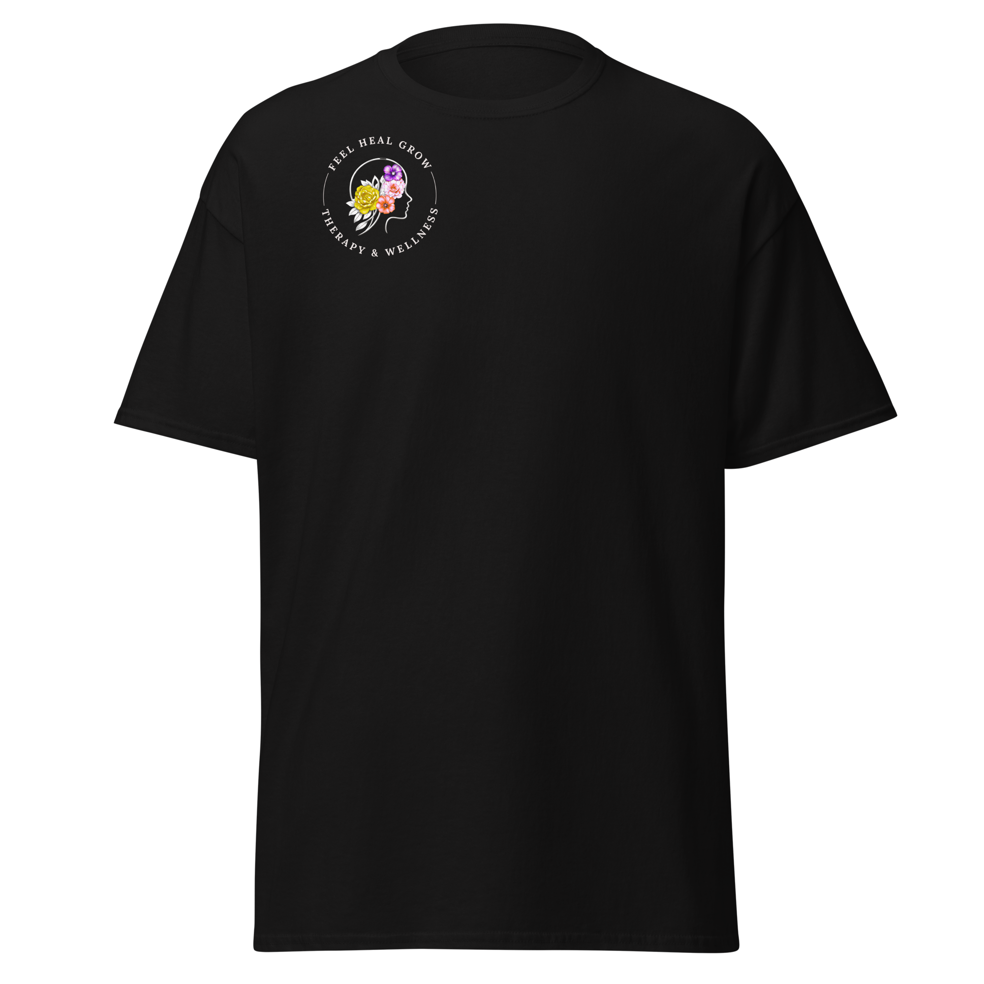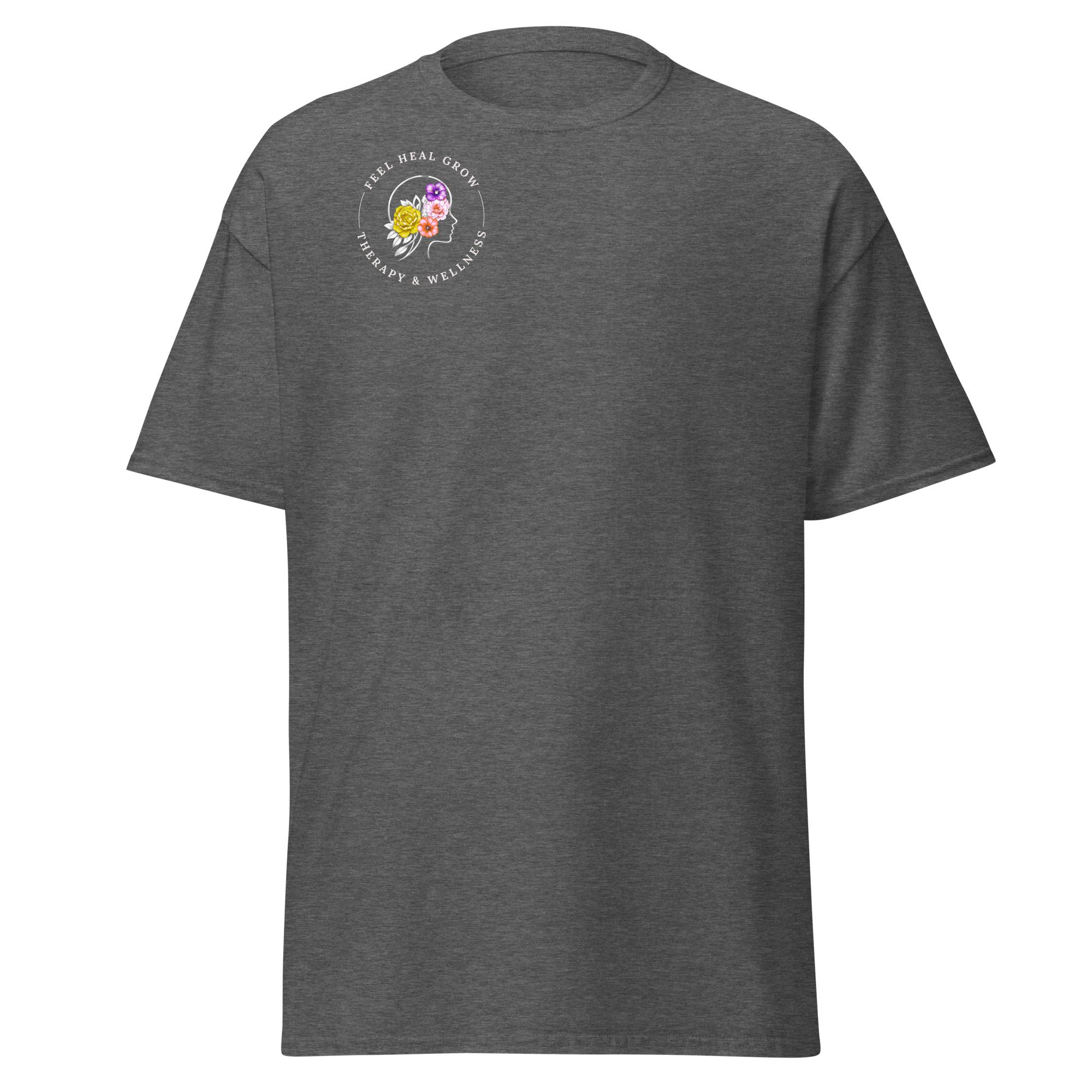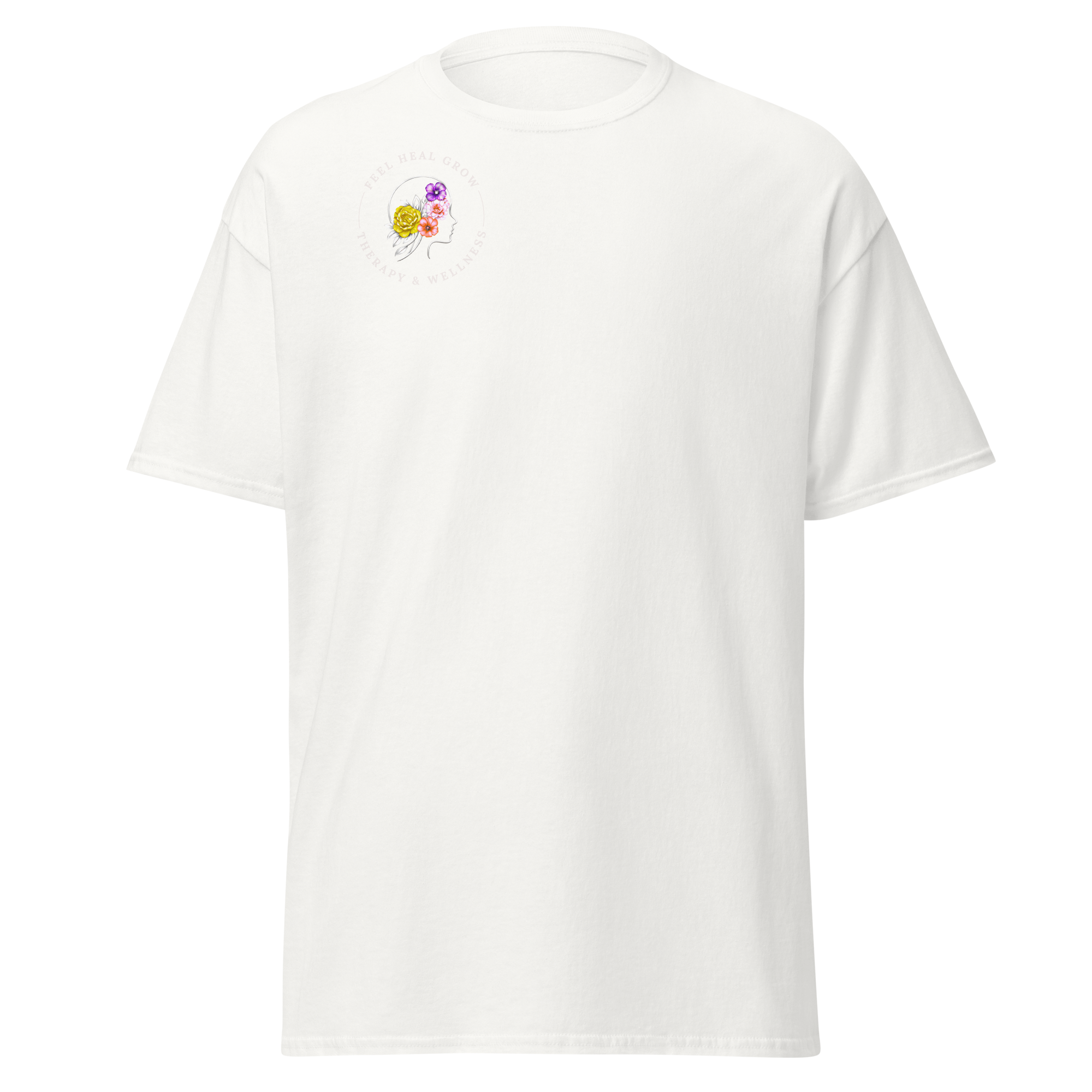 A soft, everyday reminder that healing is possible. This women’s tee features the Feel Heal Grow Therapy & Wellness logo on the front, with a floral peace sign and the words “From Panic to Peace” on the back—symbolizing the journey from overwhelm to grounded calm. Designed for comfort and intention, it’s perfect for wherever you are in your healing process.
